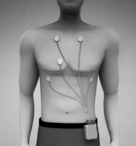 It consists of electrodes (the sticky dots that go onto your chest like a regular ECG), wires and a small machine that attaches to your waistband or hangs around your neck – this bit records the ECG onto a small hard drive. The picture above gives you an idea of what it looks like.